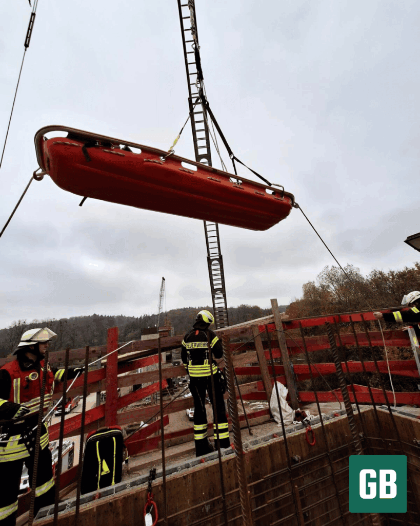 Im November fand eine Übung der Freiwilligen Feuerwehr Mörlenbach auf unserer Baustelle statt. Dabei wurde die Bergung eines Verletzten aus dem eingeschalten und teilbewehrten Pfeiler sowie dem Stahltrog geübt.